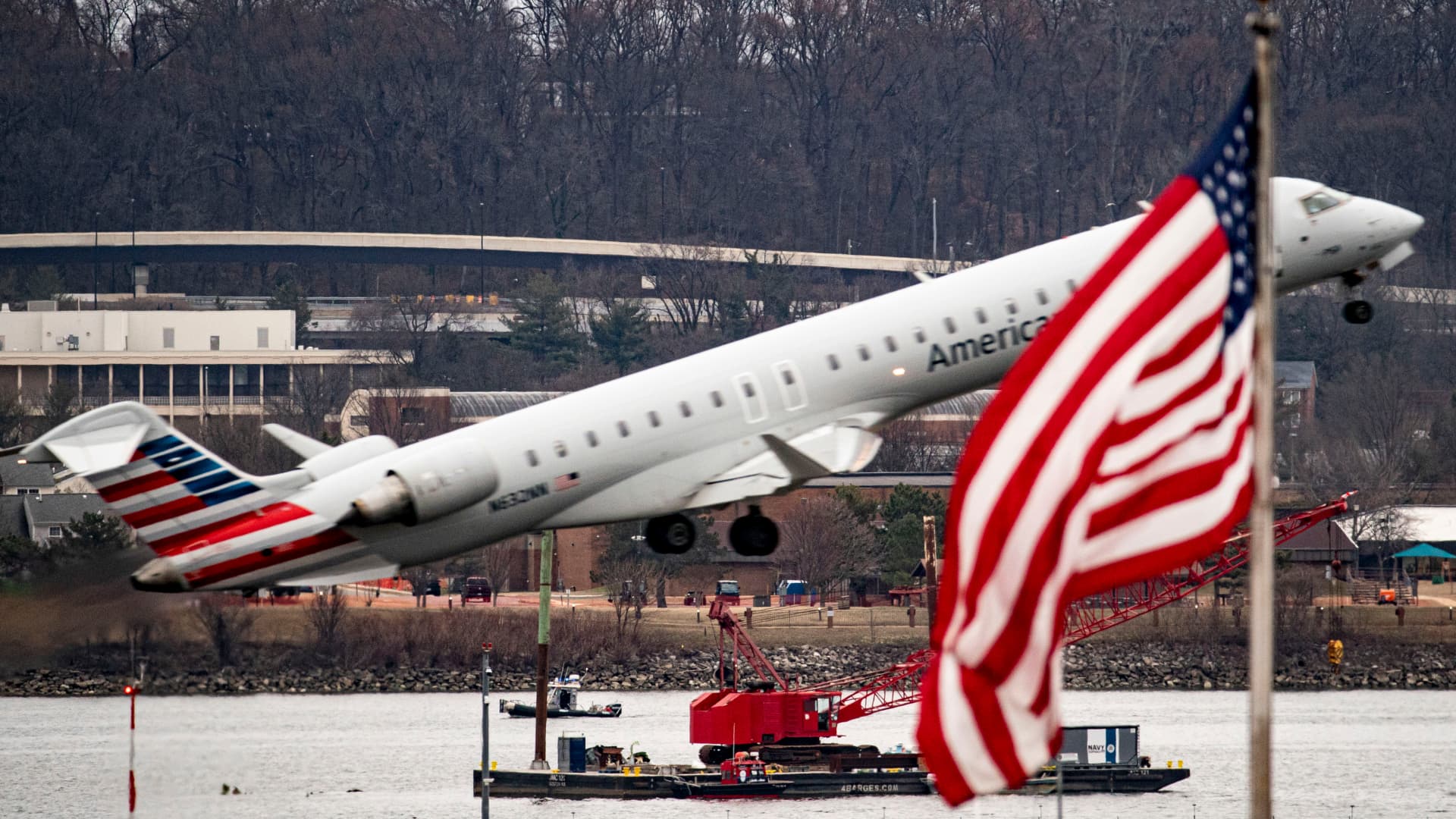 An American Airlines plane takes off as a salvage barge with a crane is positioned near the crash site along the Potomac River after a passenger jet collided with a helicopter while landing at Ronald Reagan Washington National Airport (DCA) in Arlington, Virginia, US, on Sunday, Feb. 2, 2025. Al Drago | Bloomberg | Getty […]