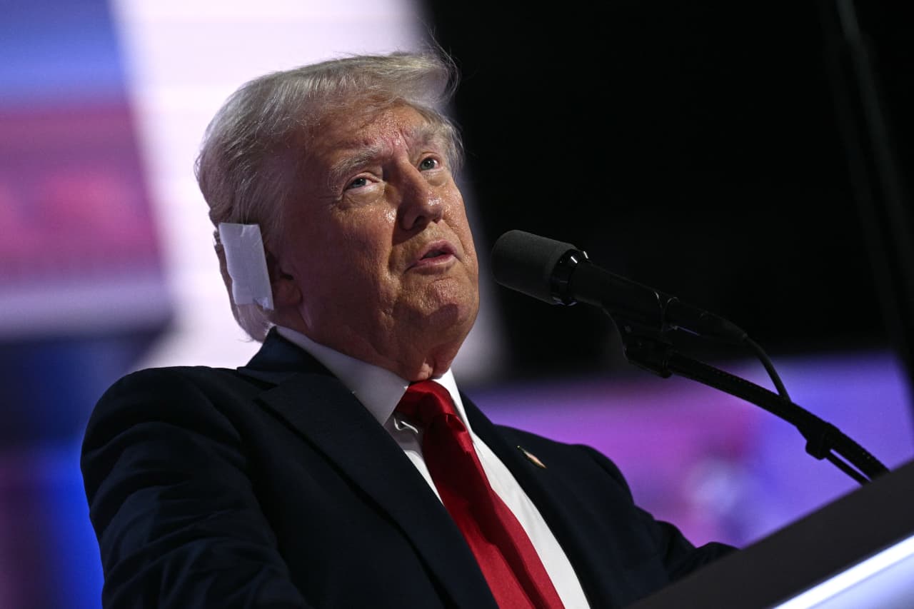 Republican presidential nominee Donald Trump speaks on the final night of his party’s convention in Milwaukee.